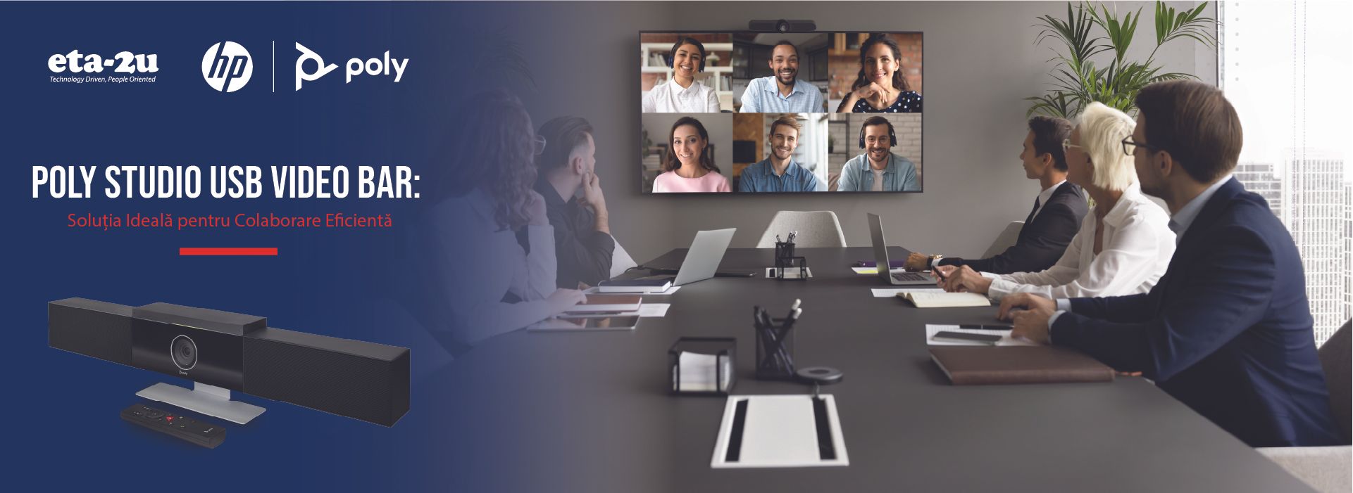 Poly Studio USB Video Bar (842D4AA): Cel mai bun pentru sălile medii, cu acustică avansată și tehnologie de reducere a zgomotului pentru o colaborare clară și eficientă.