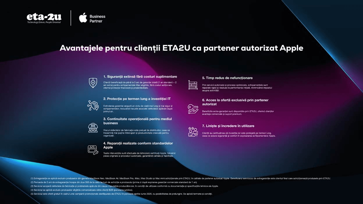 Într-un mediu de business în care continuitatea și predictibilitatea sunt esențiale, alegerea unui partener IT potrivit face diferența. Prin colaborarea cu ETA2U, companiile beneficiază nu doar de tehnologie Apple de top, ci și de un pachet extins de servicii care oferă siguranță pe termen lung.